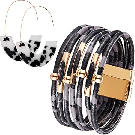 Hicarer Leopard Bracelets and Earrings for Women Cheetah Bracelets Tortoise Shell Earrings Multilayer Leather Wrap…