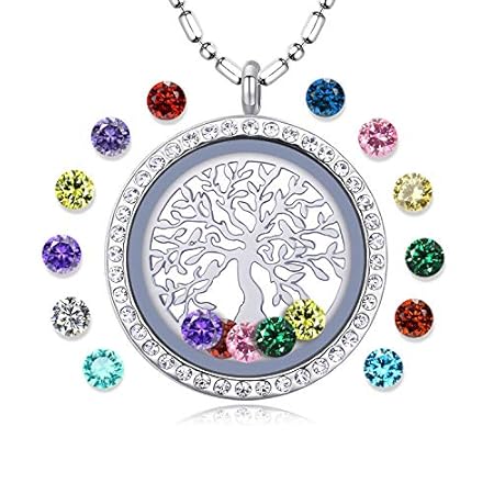 feilaiger Family Tree of Life Floating Living Memory Locket Pendant Necklace with Birthstone, All Charms Included